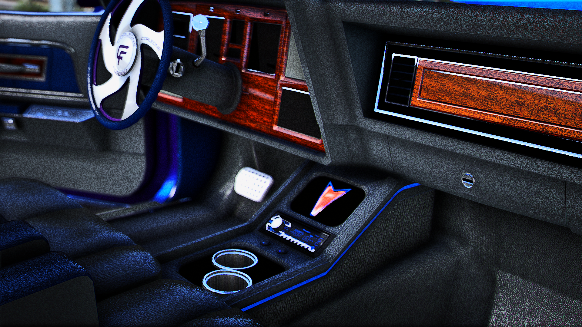 clean 81 bonnevilee coupe on corleone forged rims with the matching steering wheel custom tiarra grill console and trunk
