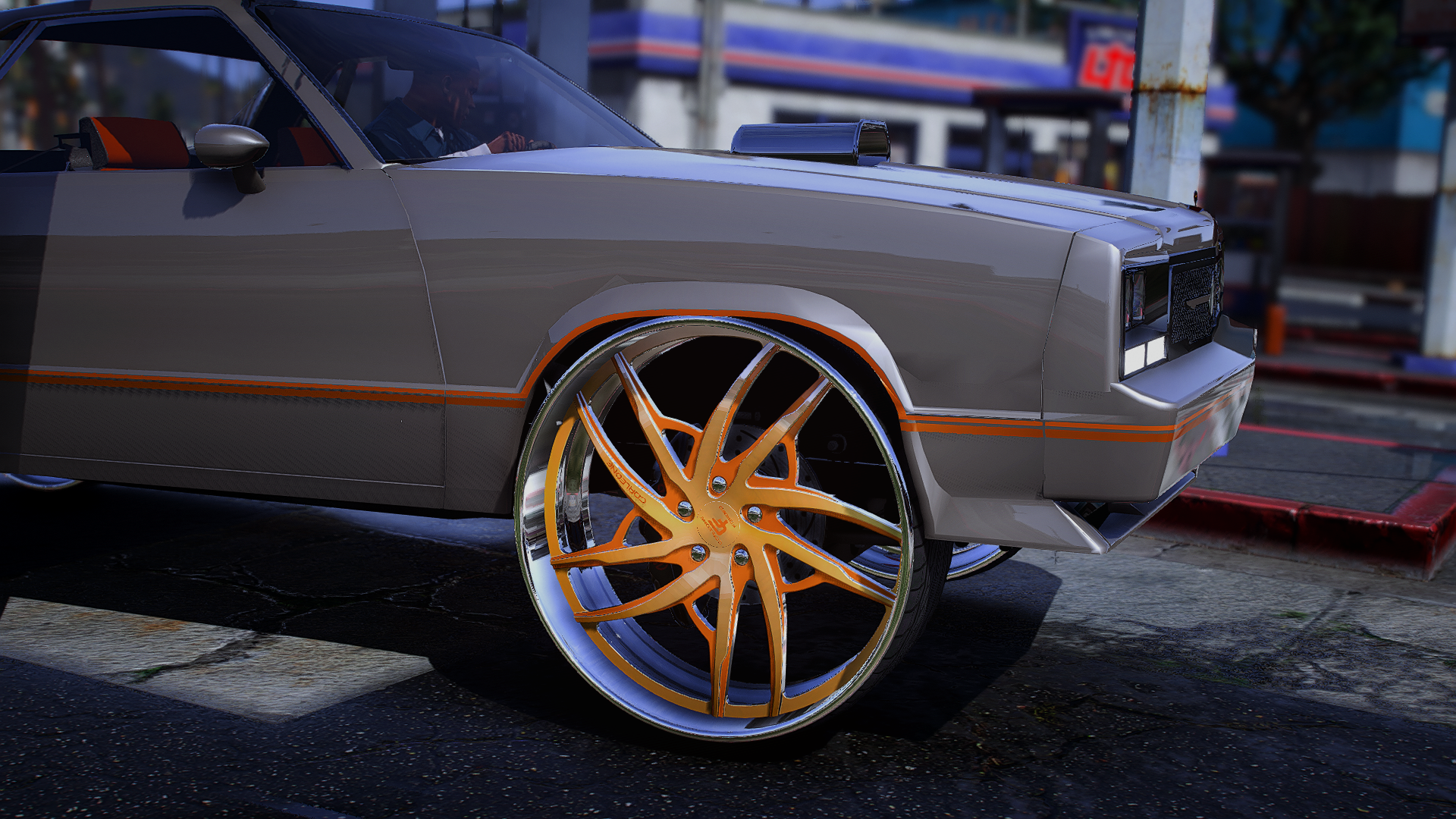 SS El Camino on Corleones with matching steering wheel blower out the hood custom speaker box super clean this is story mode and FiveM ready
