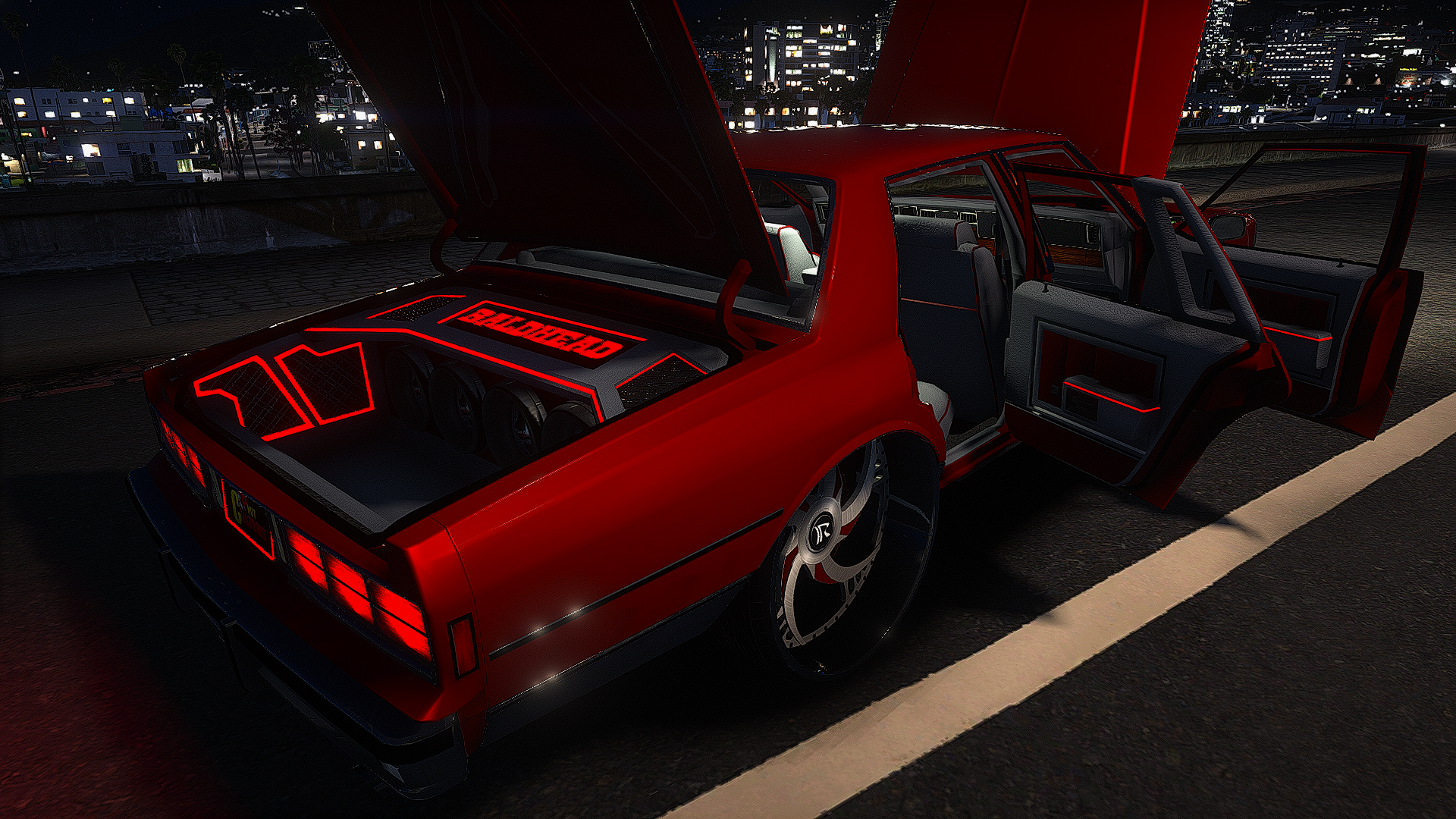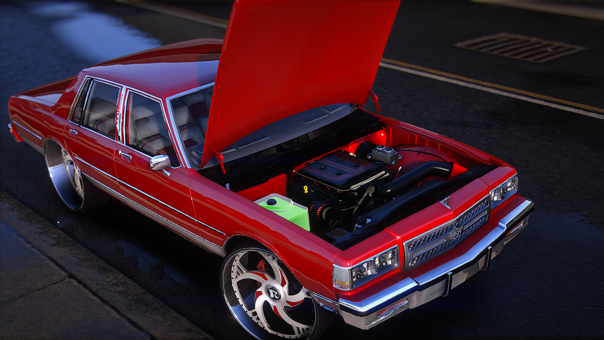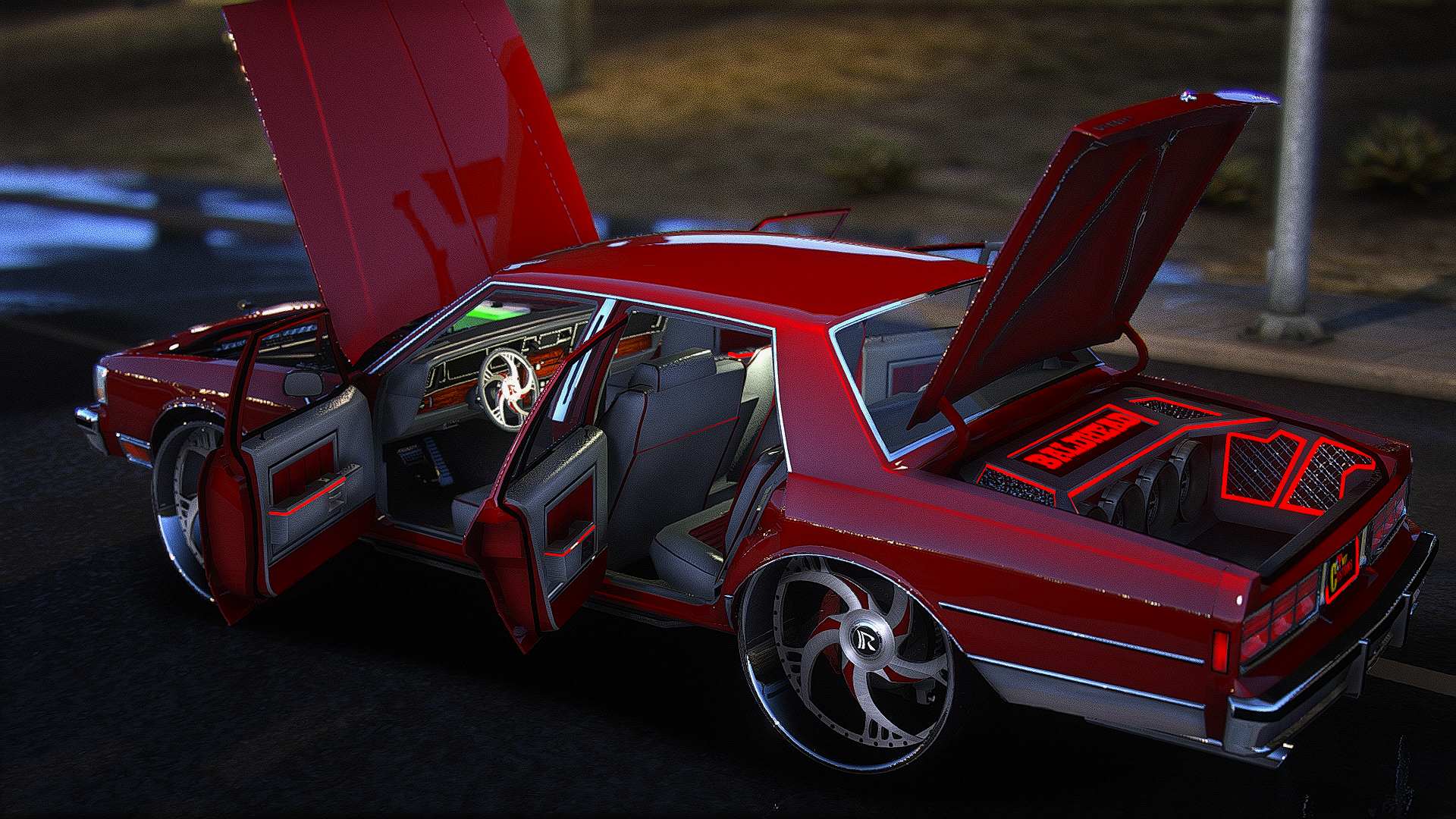87 baldhead caprice on staggered ruccis with the floating big caps and a working digital dash custom dashboard and trunk