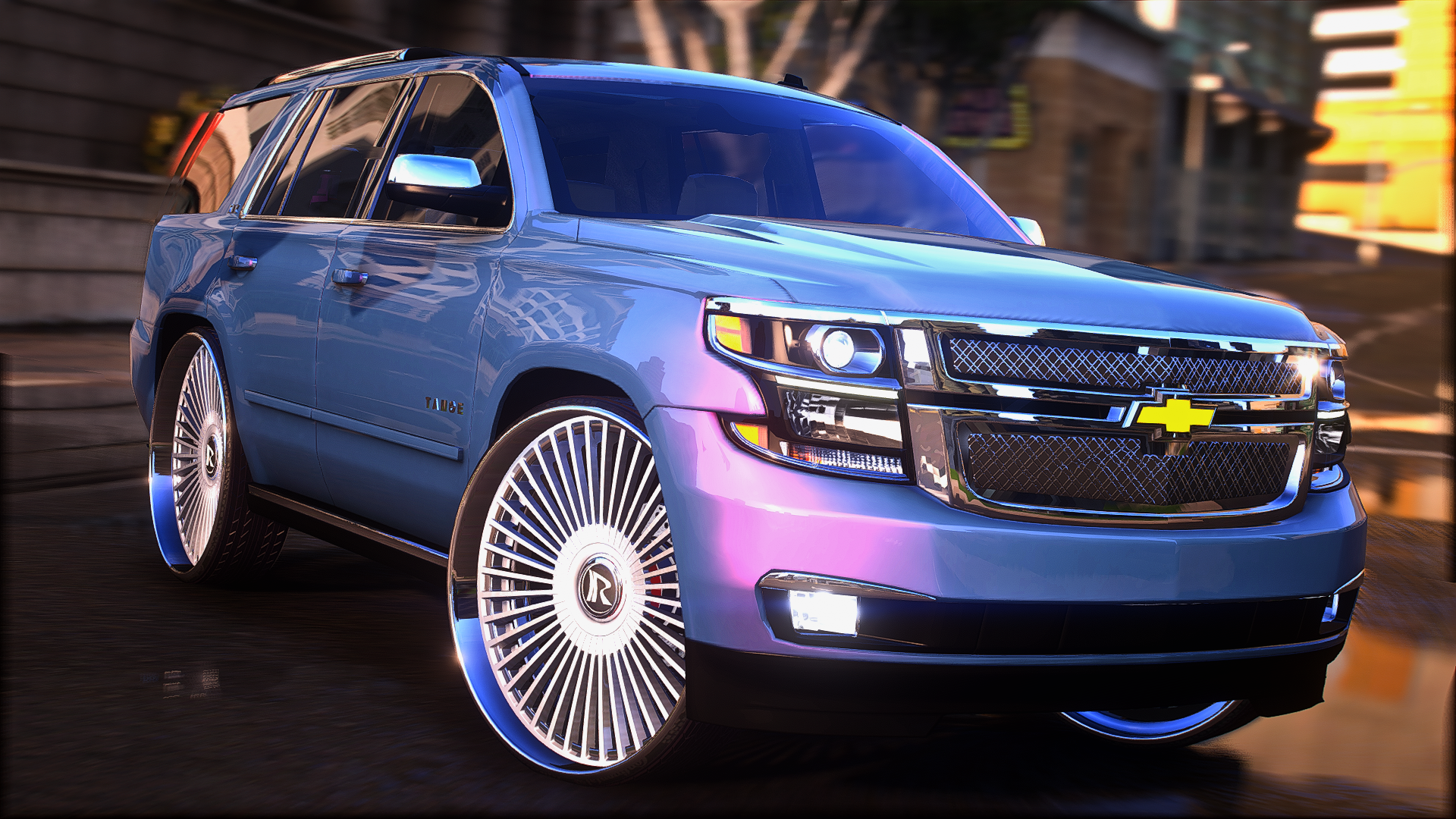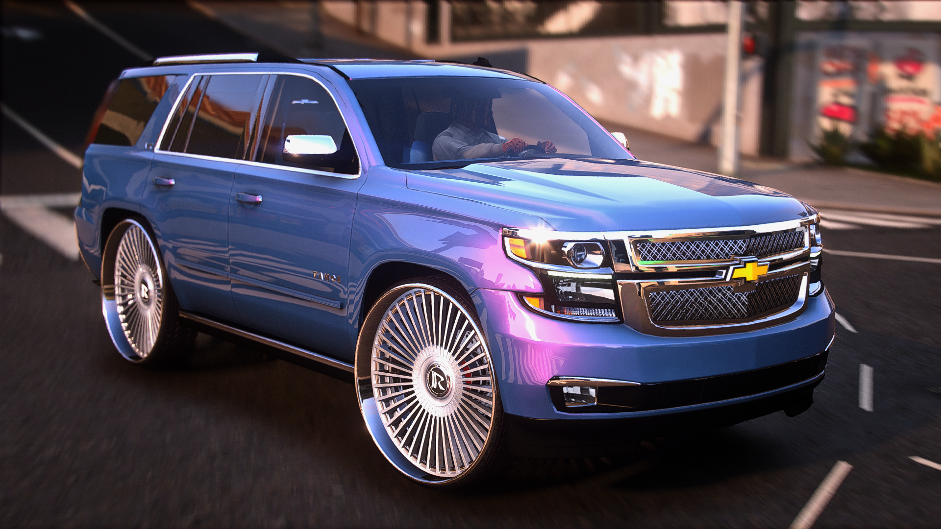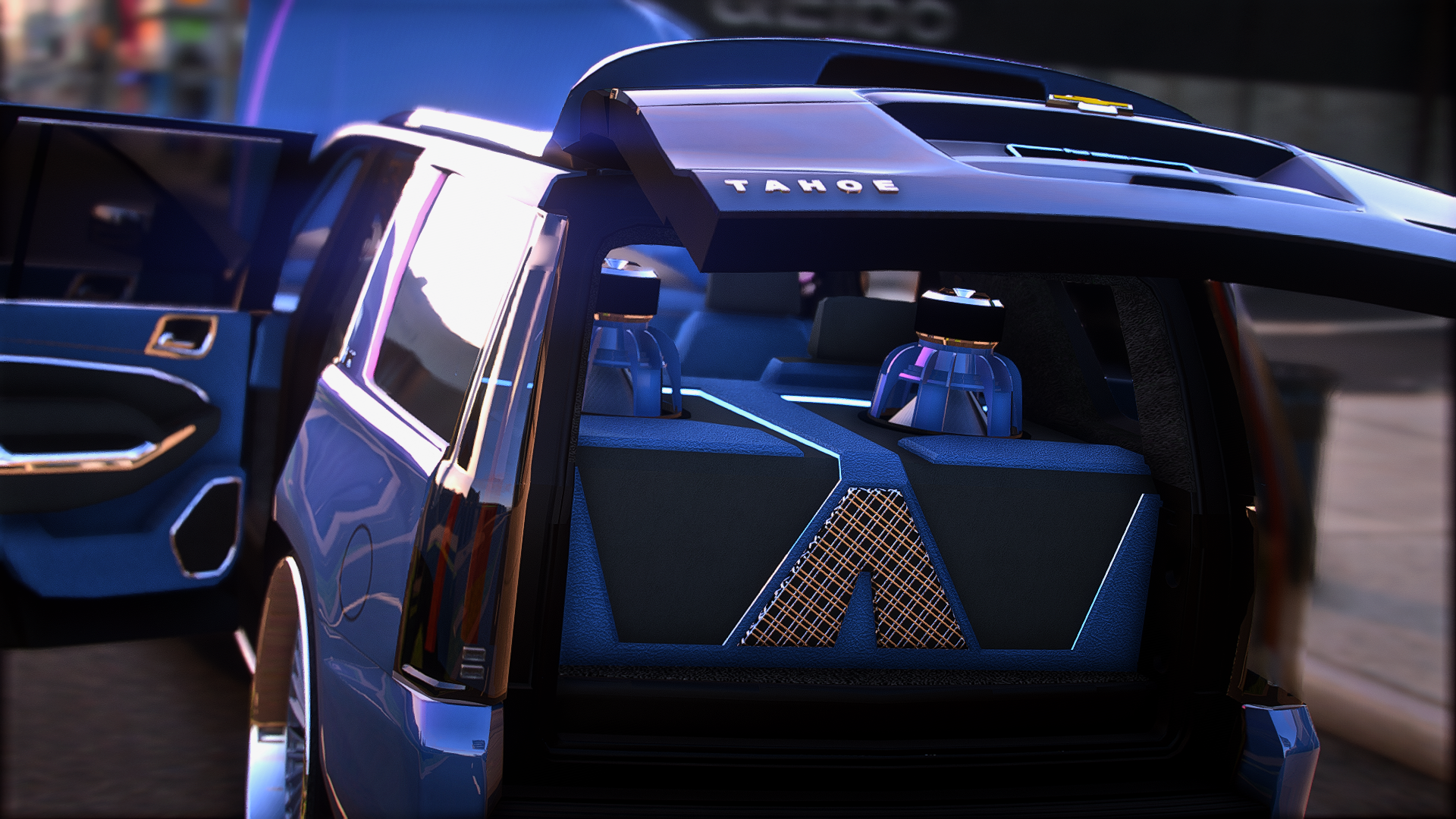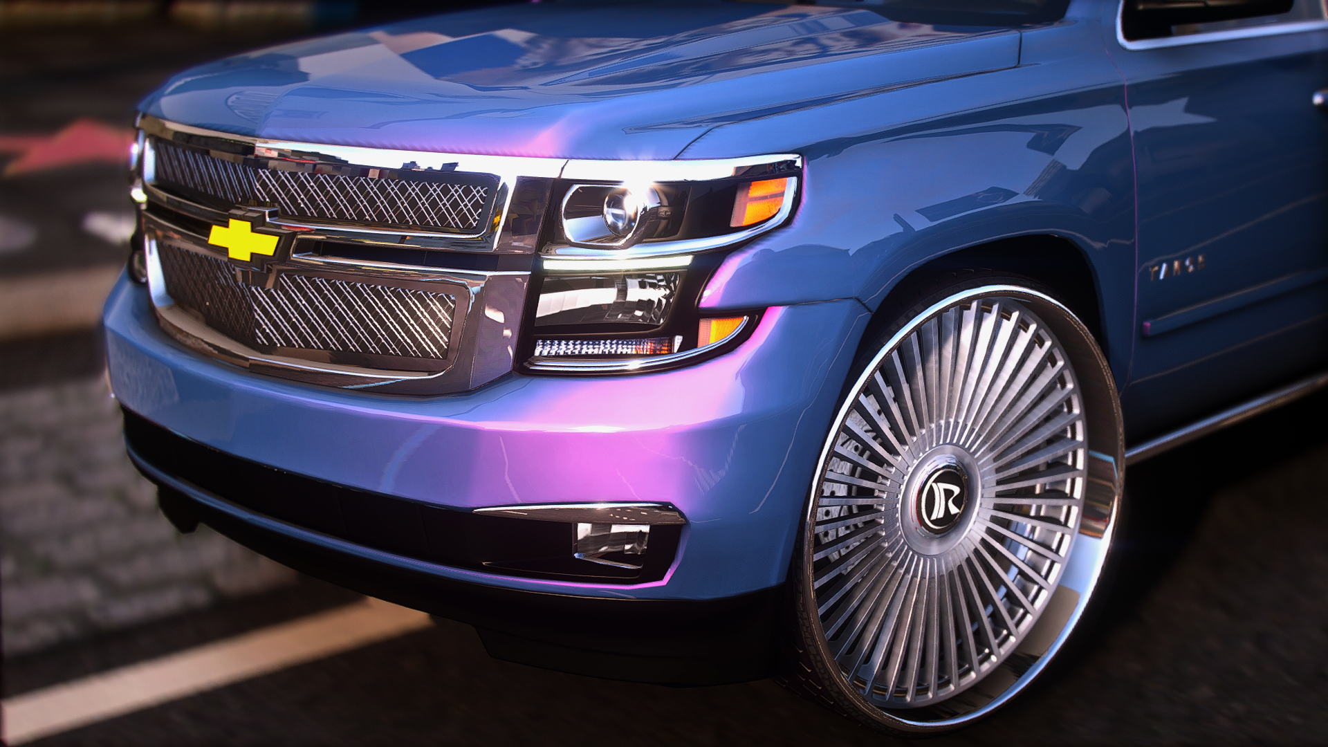 2015 tahoe on 30 inch ruccis with the floating cap custom grill completely retextured interior and a custom subwoofer box storymode and five m ready