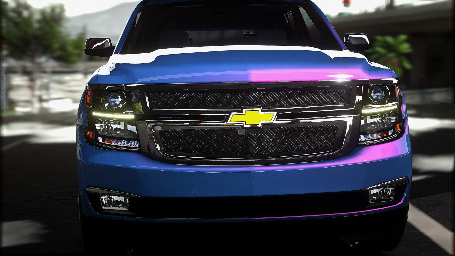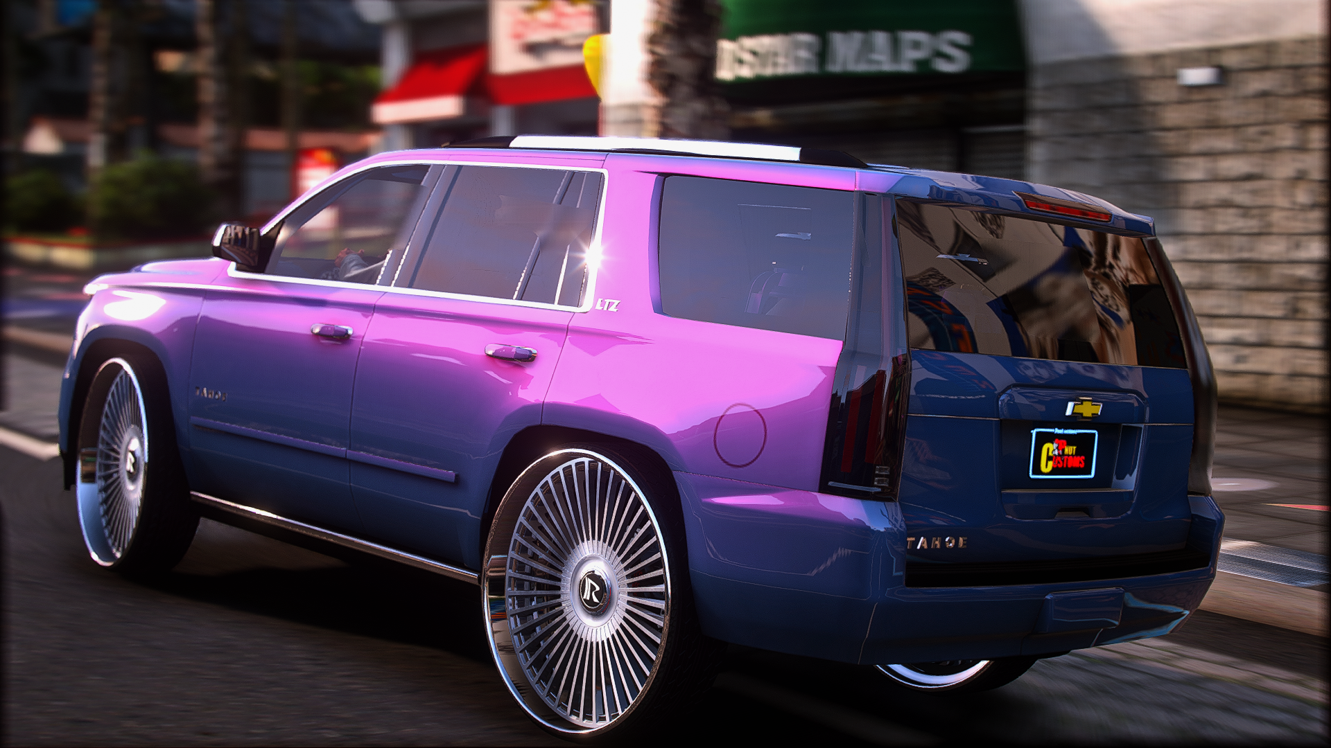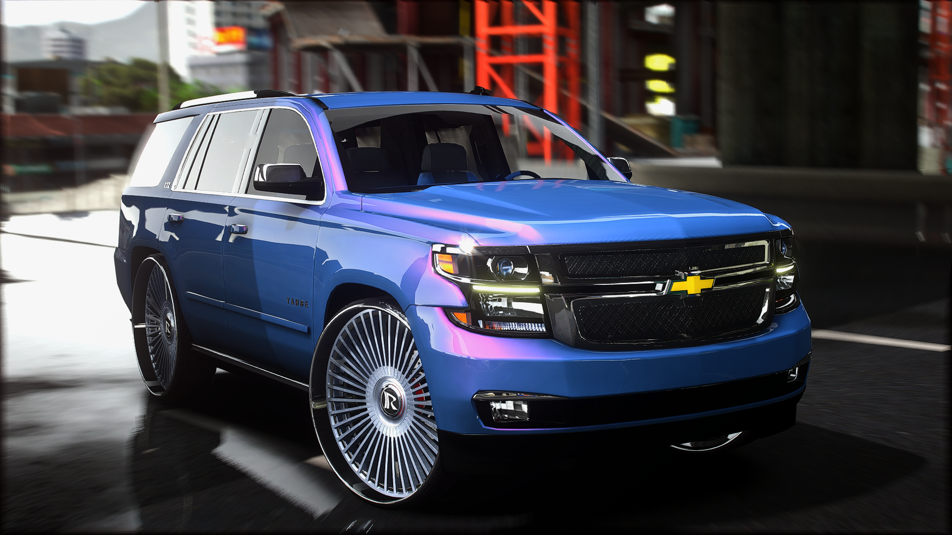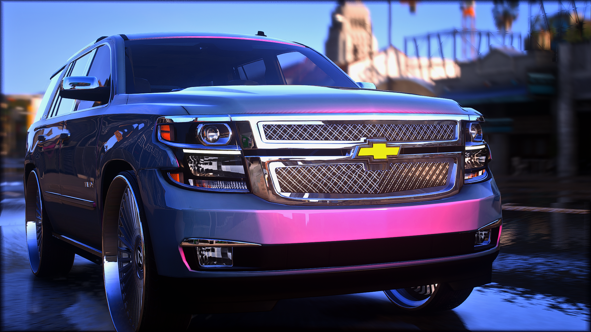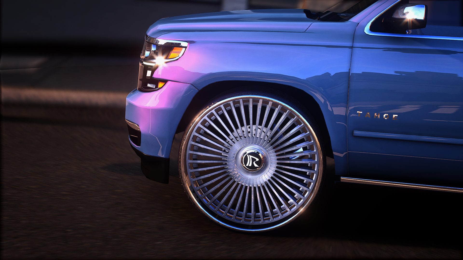 2015 tahoe on 30 inch ruccis with the floating cap custom grill completely retextured interior and a custom subwoofer box storymode and five m ready