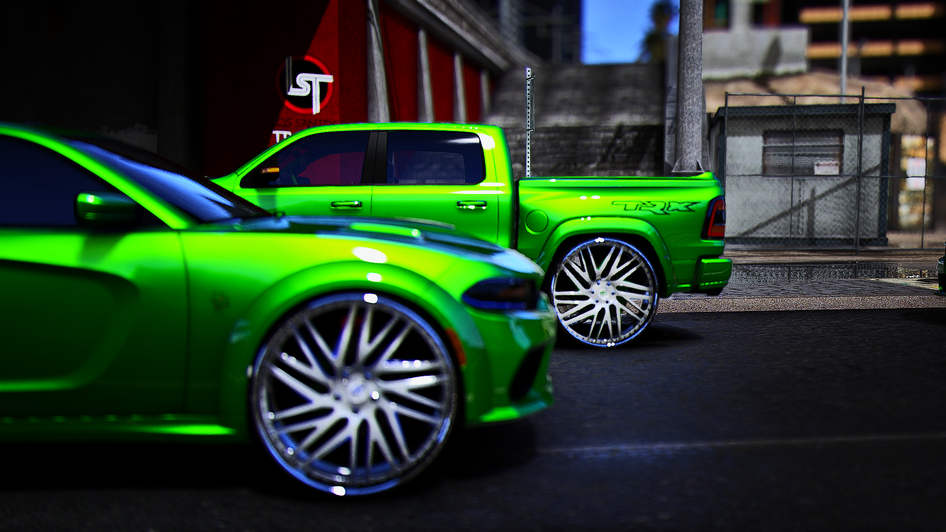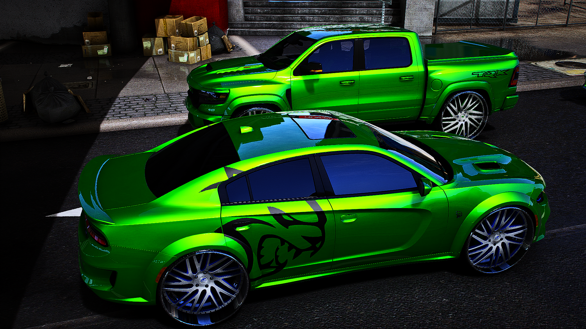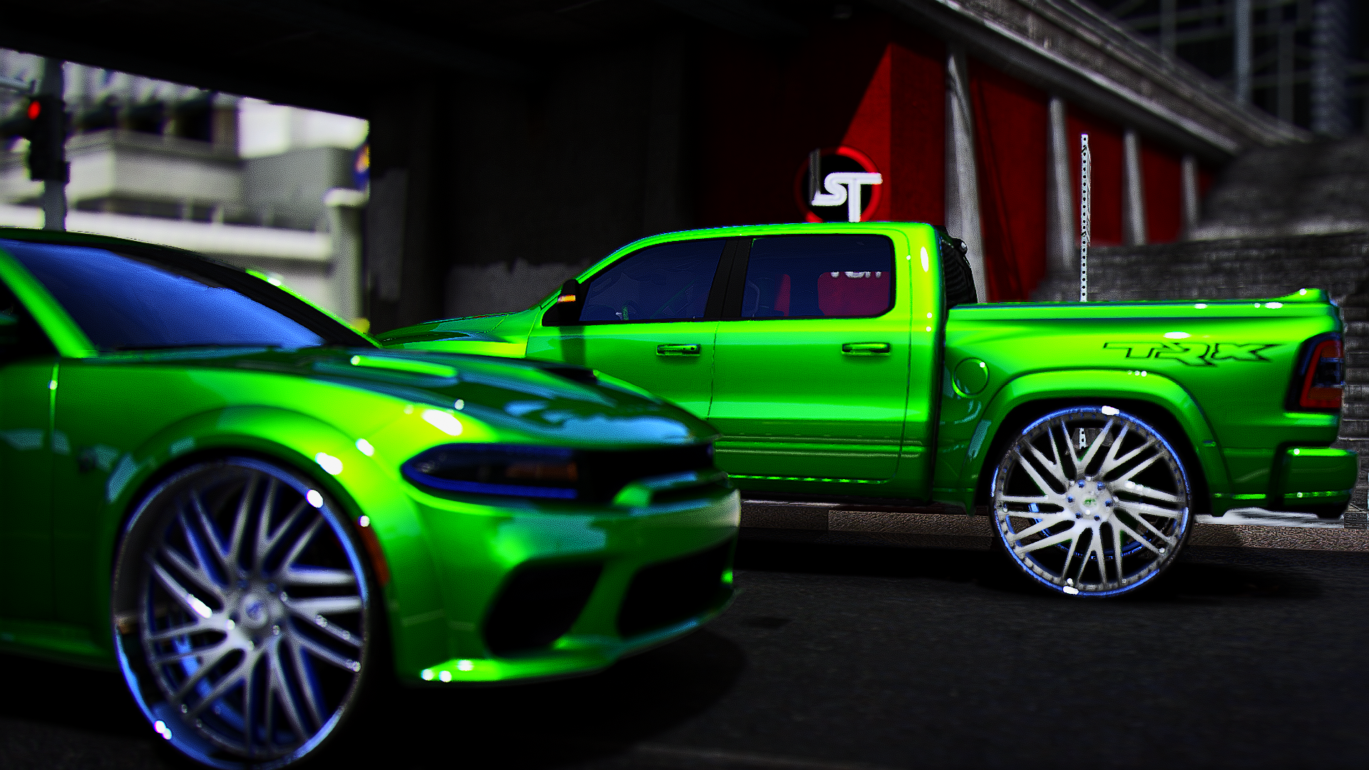 clean hell cat and trx on matching amani rims fast with the demon v8 motor sound