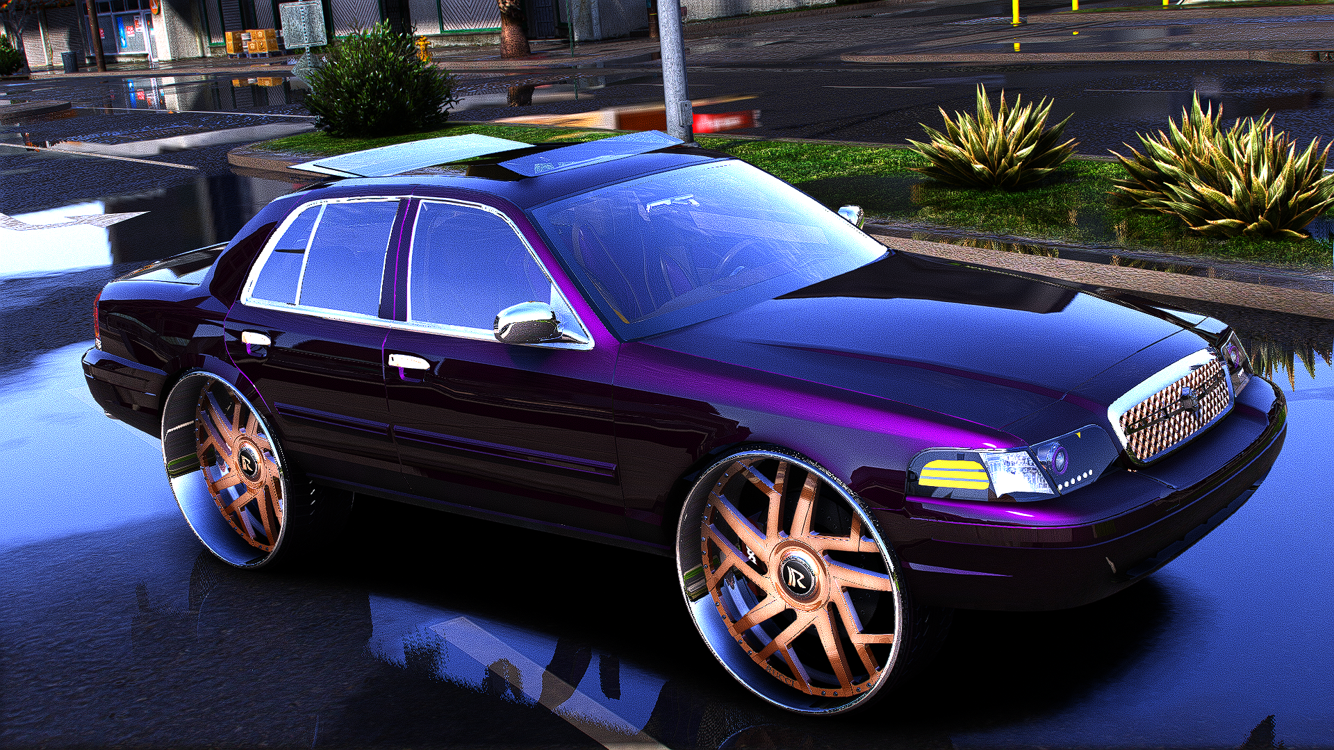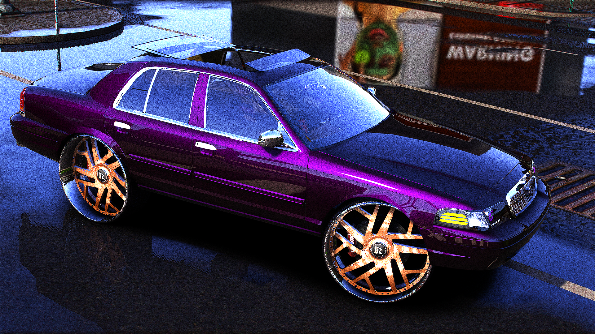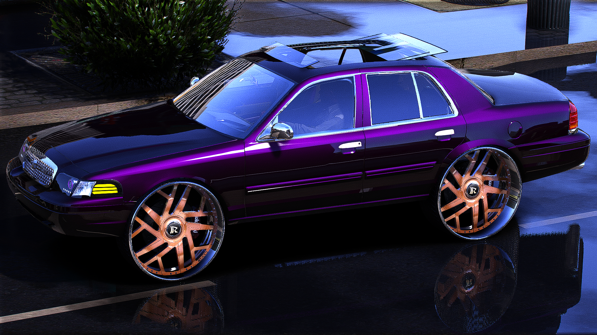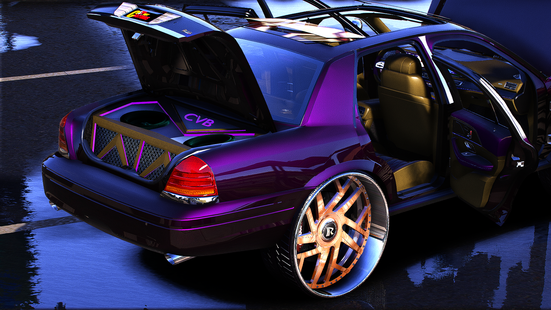 crownvic with the g6 sunroof on 32 inch rucci rims with the big floating caps custom trunk with the benz interior story mode and five m ready