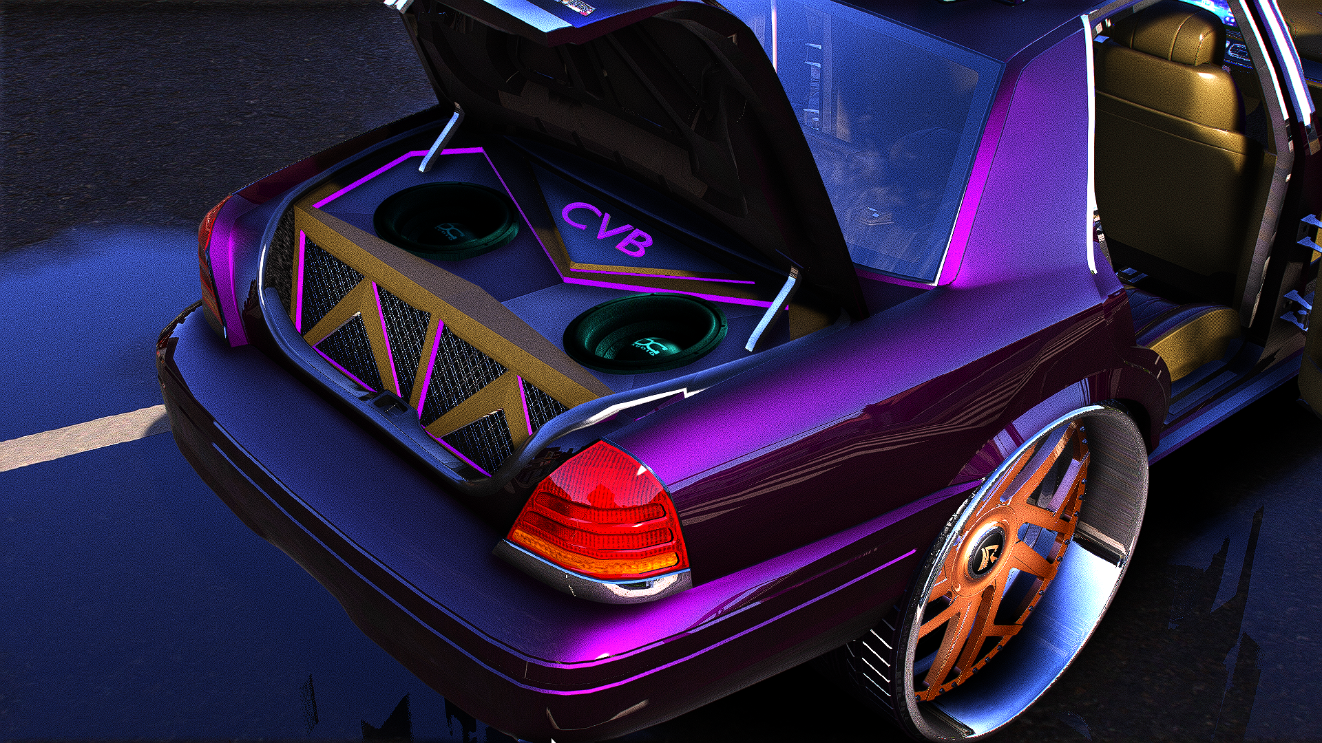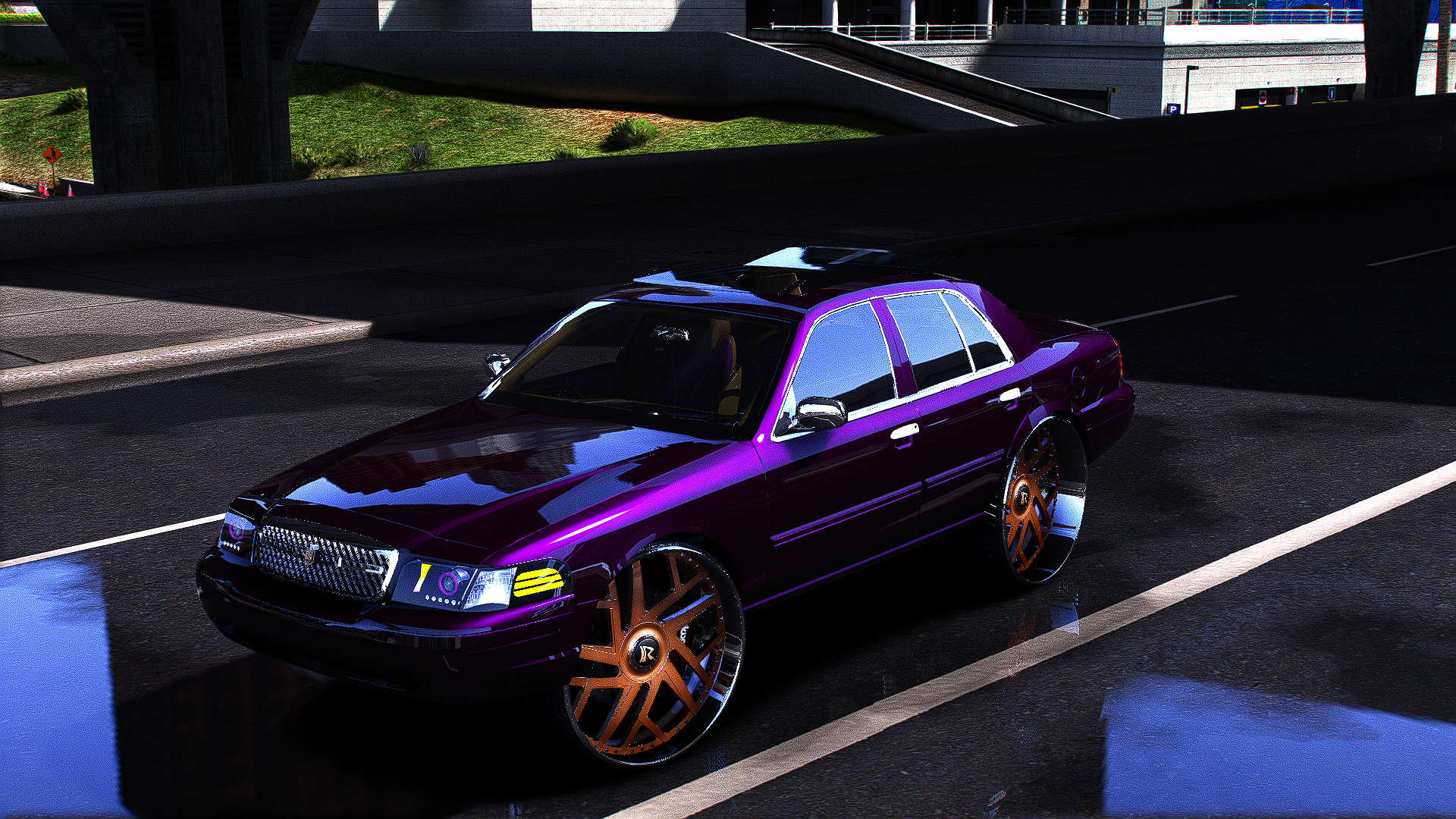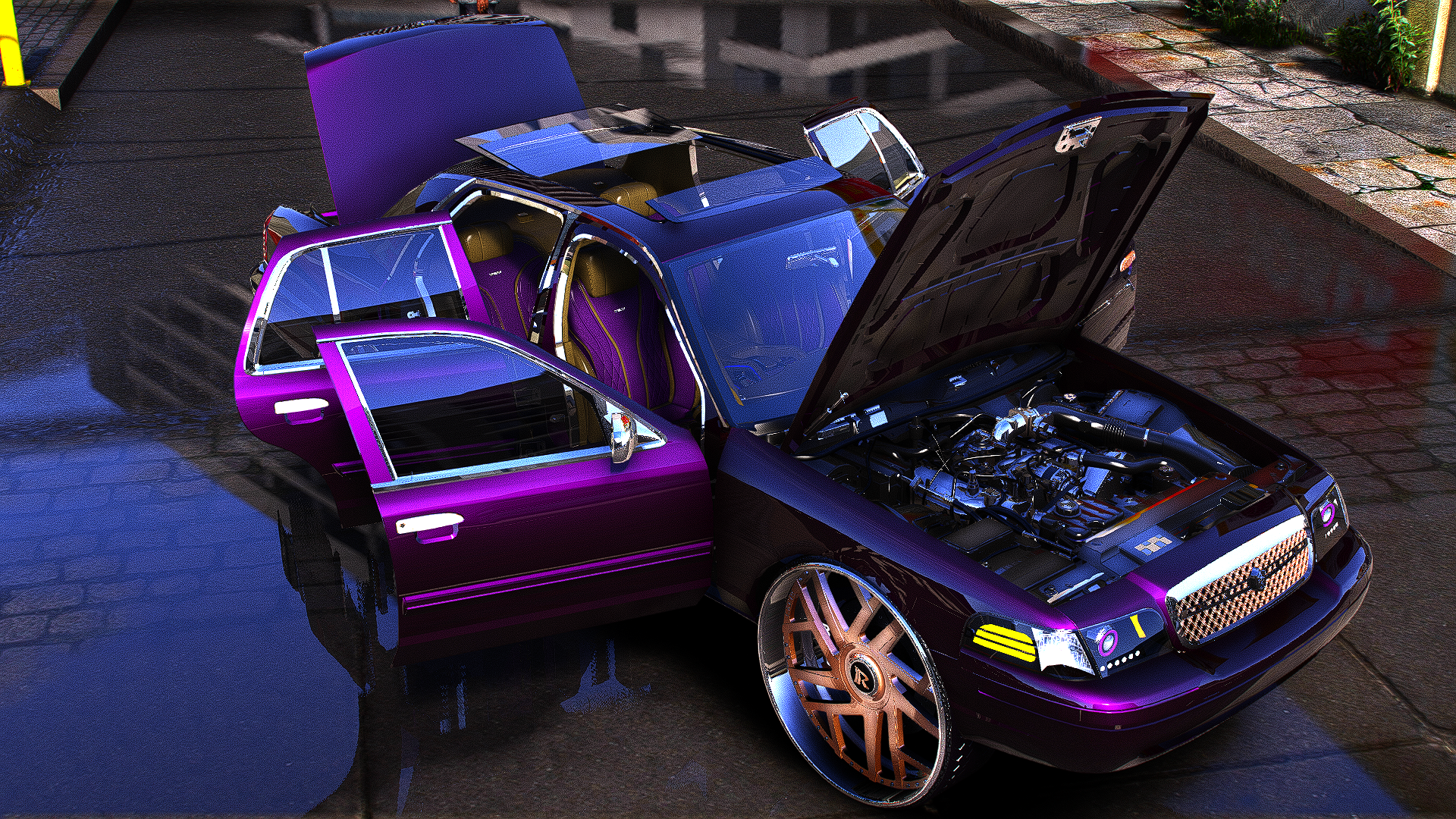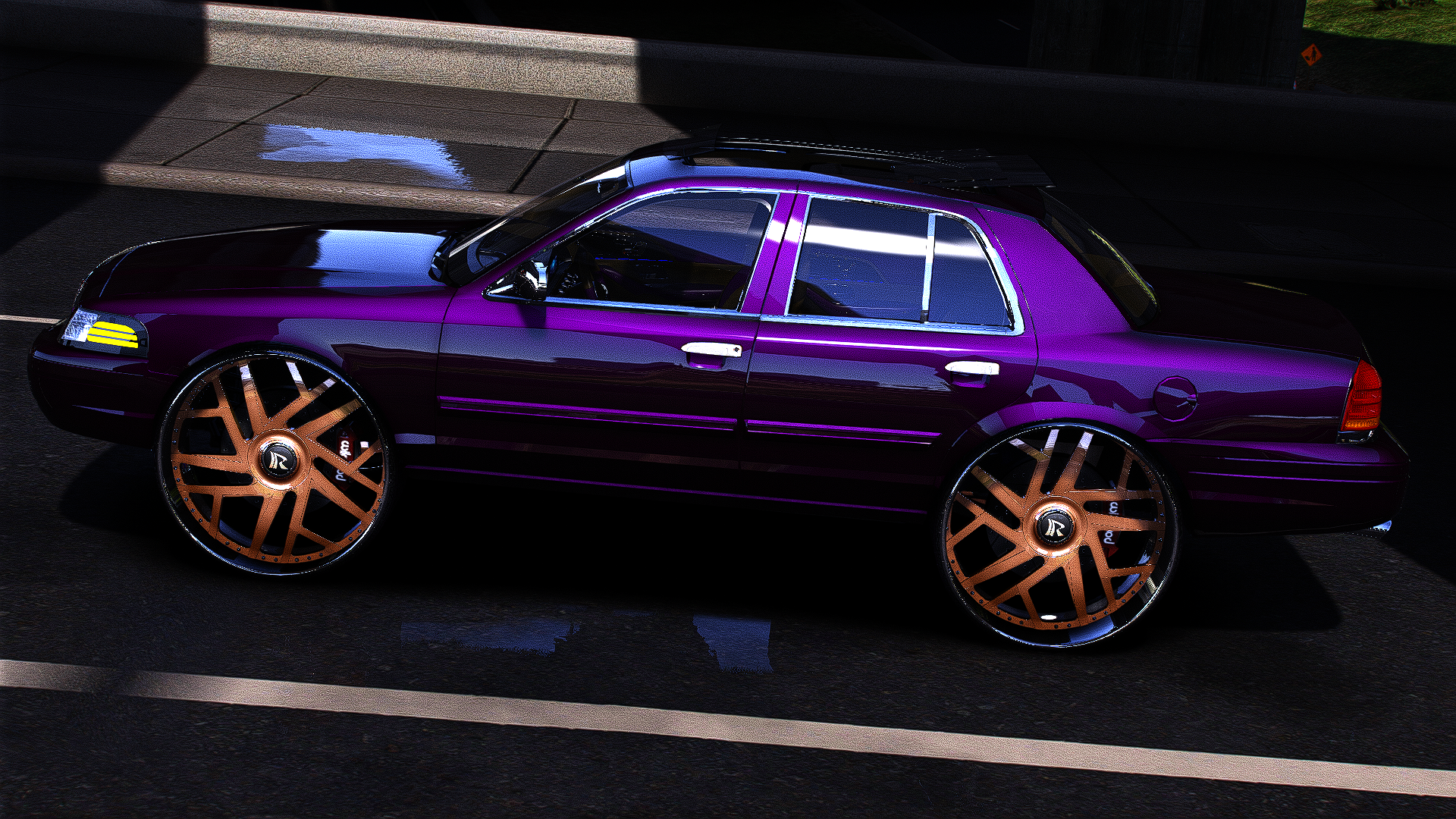 crownvic with the g6 sunroof on 32 inch rucci rims with the big floating caps custom trunk with the benz interior story mode and five m ready